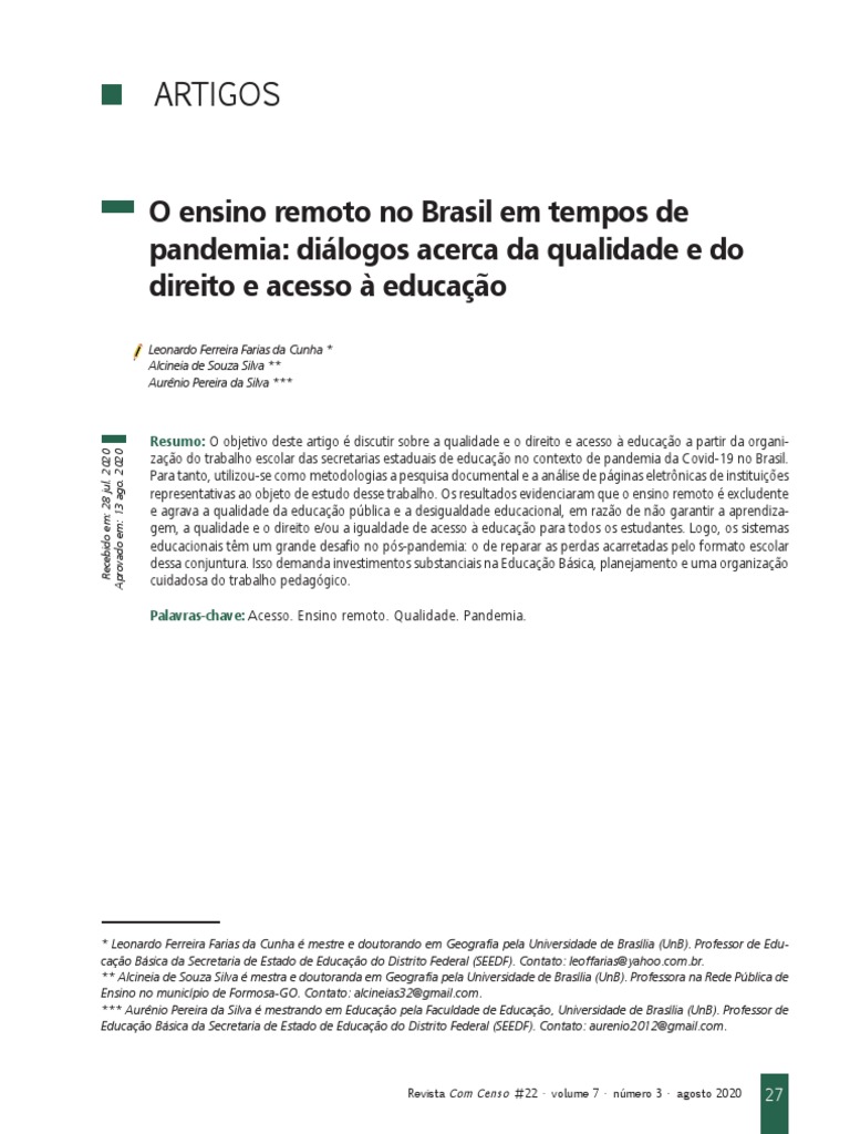 Palavras-chave: Acesso. Ensino remoto. Qualidade. Pandemia.