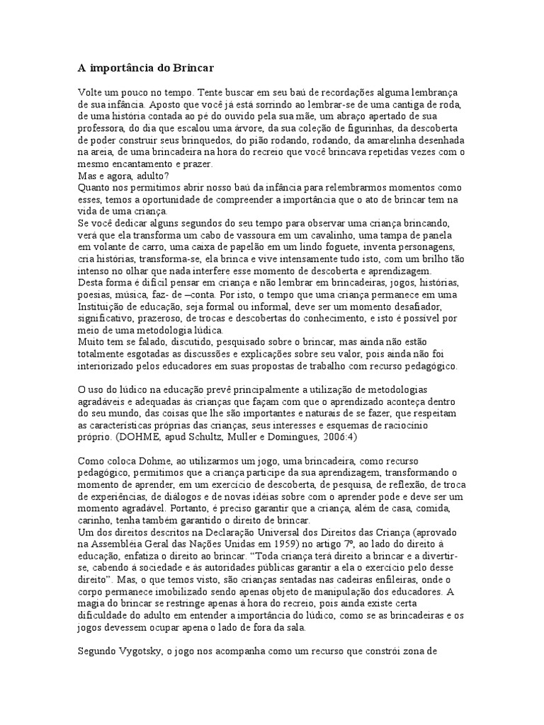 esses, temos a oportunidade de compreender a importância que o ato de brincar tem na