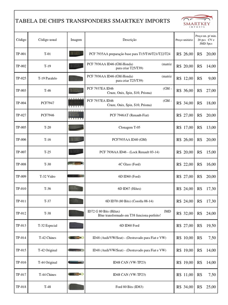 TABELA DE CHIPS TRANSPONDERS SMARTKEY IMPORTS