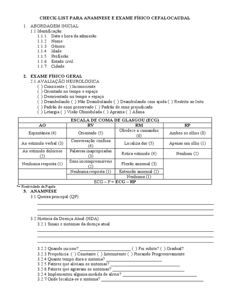 CHECK-LIST PARA ANAMNESE E EXAME FÍSICO CEFALOCAUDAL
