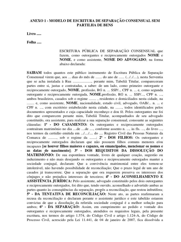 ANEXO 1 - MODELO DE ESCRITURA DE SEPARAÇÃO CONSENSUAL SEM
