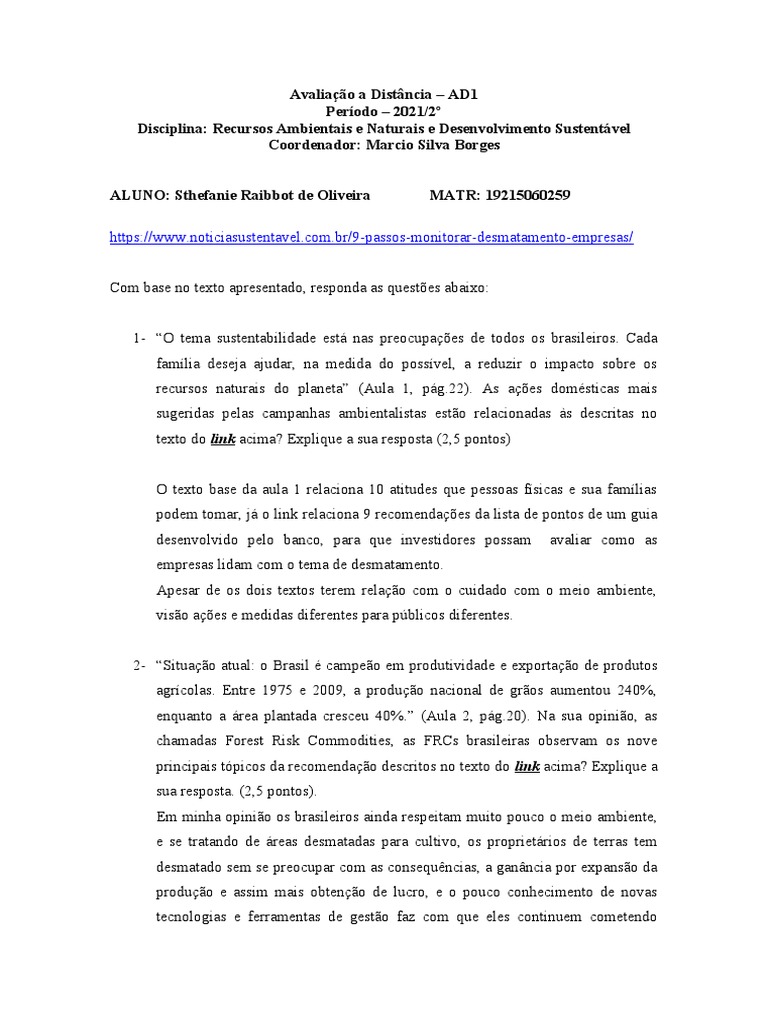 Disciplina: Recursos Ambientais e Naturais e Desenvolvimento Sustentável