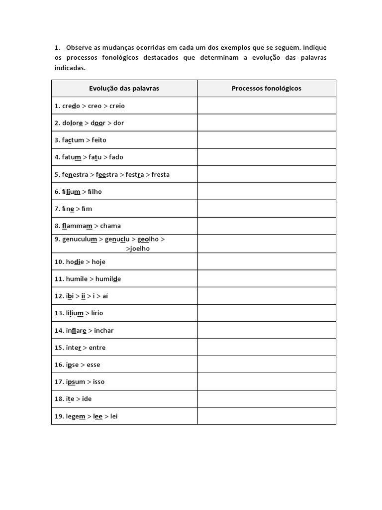 Evolução das palavras Processos fonológicos