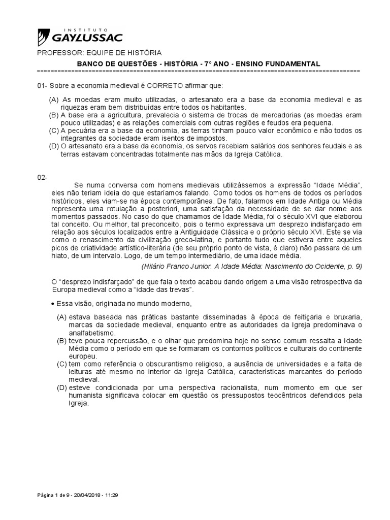 BANCO DE QUESTÕES - HISTÓRIA - 7º ANO - ENSINO FUNDAMENTAL