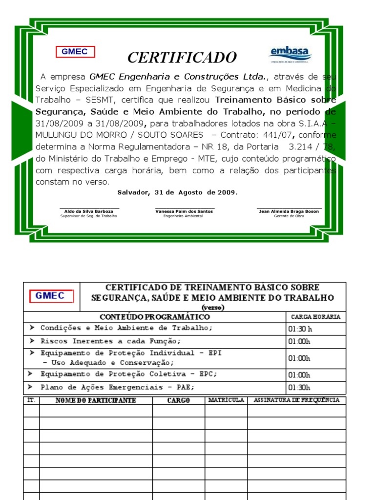 Trabalho – SESMT, certifica que realizou Treinamento Básico sobre