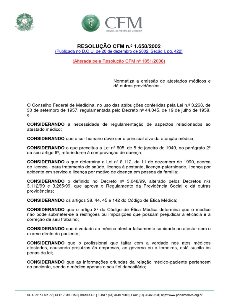 Art. 1º O atestado médico é parte integrante do ato médico, sendo seu fornecimento
