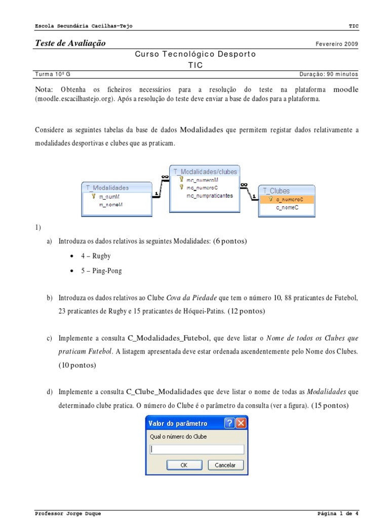 (moodle.escacilhastejo.org). Após a resolução do teste deve enviar a base de dados para a plataforma.
