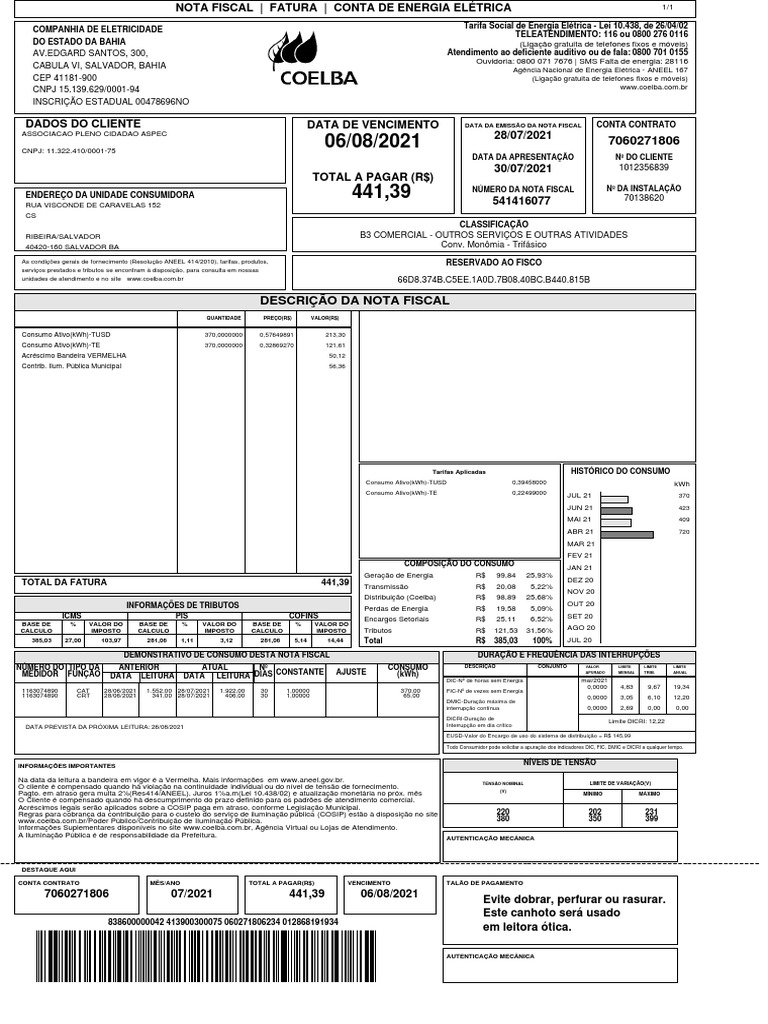 ENDEREÇO DA UNIDADE CONSUMIDORA 441,39 NÚMERO DA NOTA FISCAL