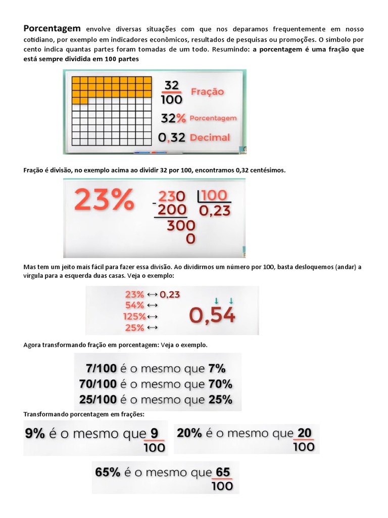 cento indica quantas partes foram tomadas de um todo. Resumindo: a porcentagem é uma fração que