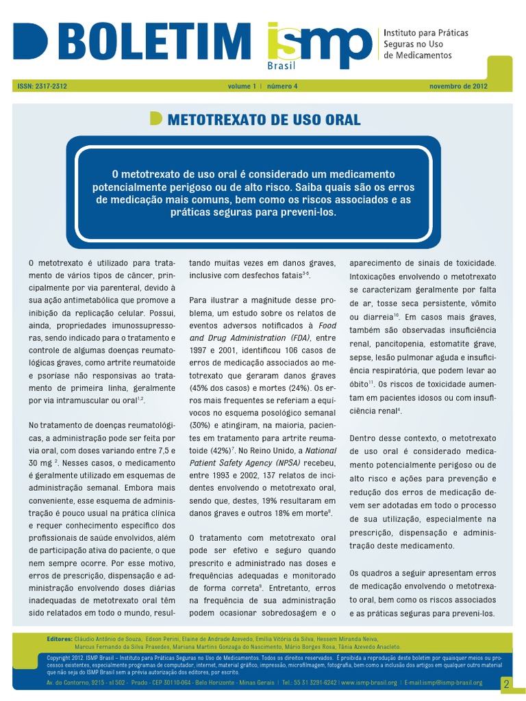 <http://www.imsn.ie/IMSN%20Methotrexate%20Safety%20Alert%20.pdf>. Acesso em: 28 set 2012. 14 National Patient Safety Agency. Towards the safer use of oral methotrexate. 2004. Disponível em: