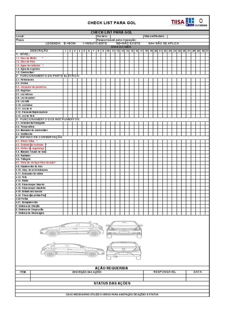 OBSERVAÇÕES: " Quando os ítens com asterisco estiverem insuficientes, o veículos não deverá ser utilizado"