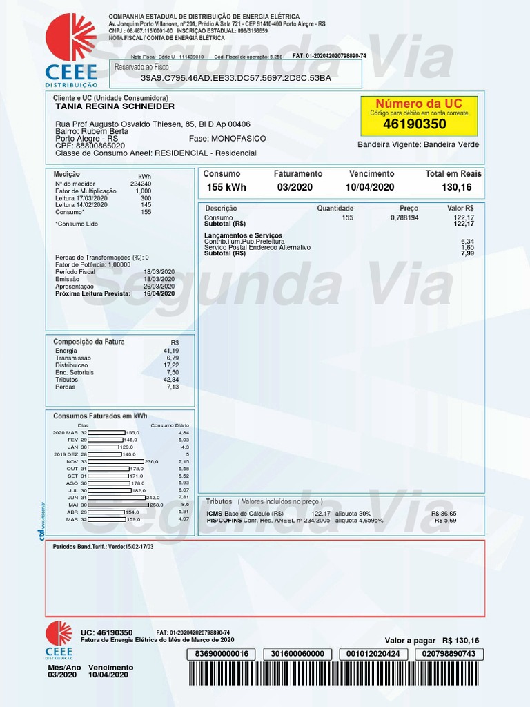 Fatura de Energia Elétrica do Mês de Março de 2020 Valor a pagar R$ 130,16
