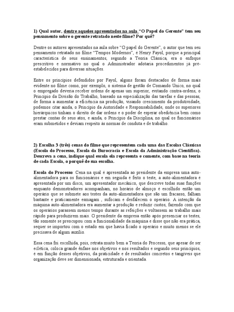 pensamento retratado no filme “Tempos Modernos”, é Henry Fayol, porque a principal