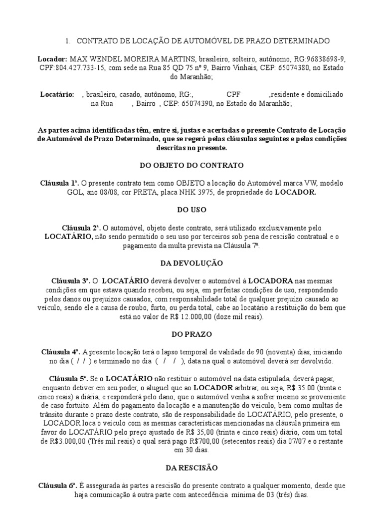 CONTRATO DE LOCAÇÃO DE AUTOMÓVEL DE PRAZO DETERMINADO