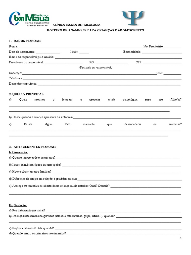 ROTEIRO DE ANAMNESE PARA CRIANÇAS E ADOLESCENTES
