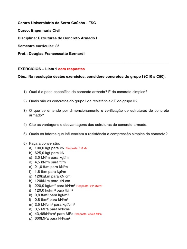 a) 100,0 kgf para kN Resposta: 1,0 kN