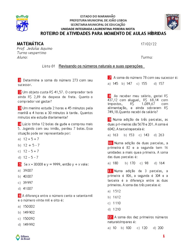 4 Lúcio tinha 12 bolas de gude e comprou mais duas pri-meiras são 5678 e 201. A soma é