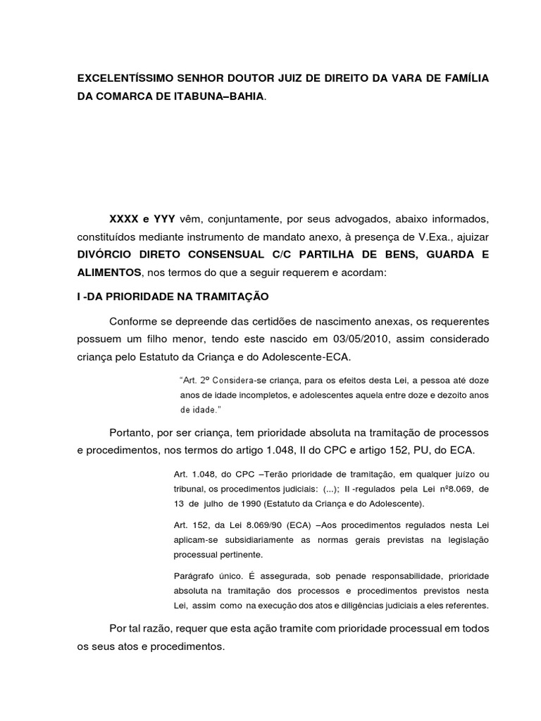 DIVÓRCIO DIRETO CONSENSUAL C/C PARTILHA DE BENS, GUARDA E