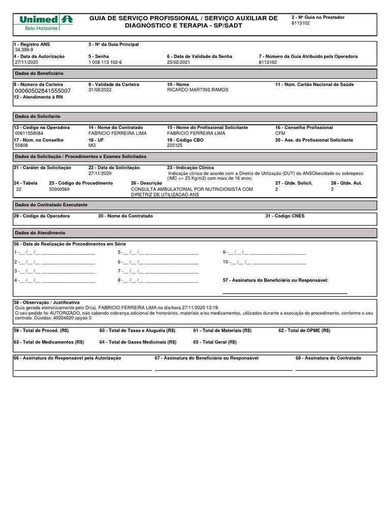 Guia gerada eletronicamente pelo Dr(a). FABRICIO FERREIRA LIMA no dia/hora 27/11/2020 13:19.