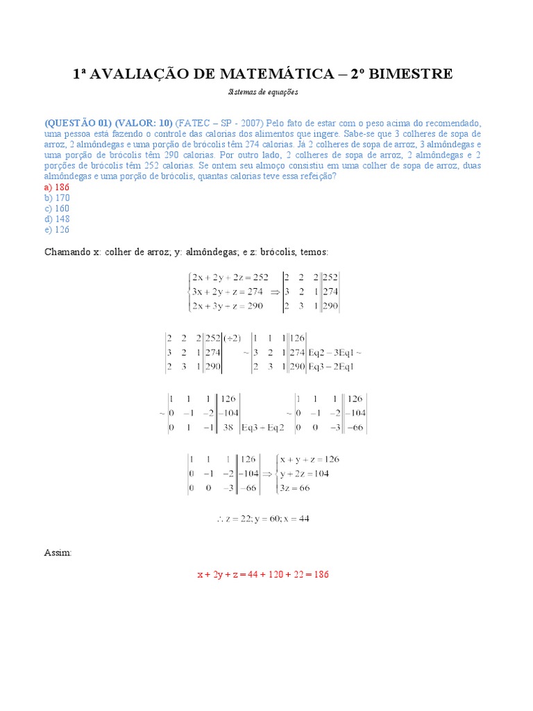 1ª AVALIAÇÃO DE MATEMÁTICA – 2º BIMESTRE