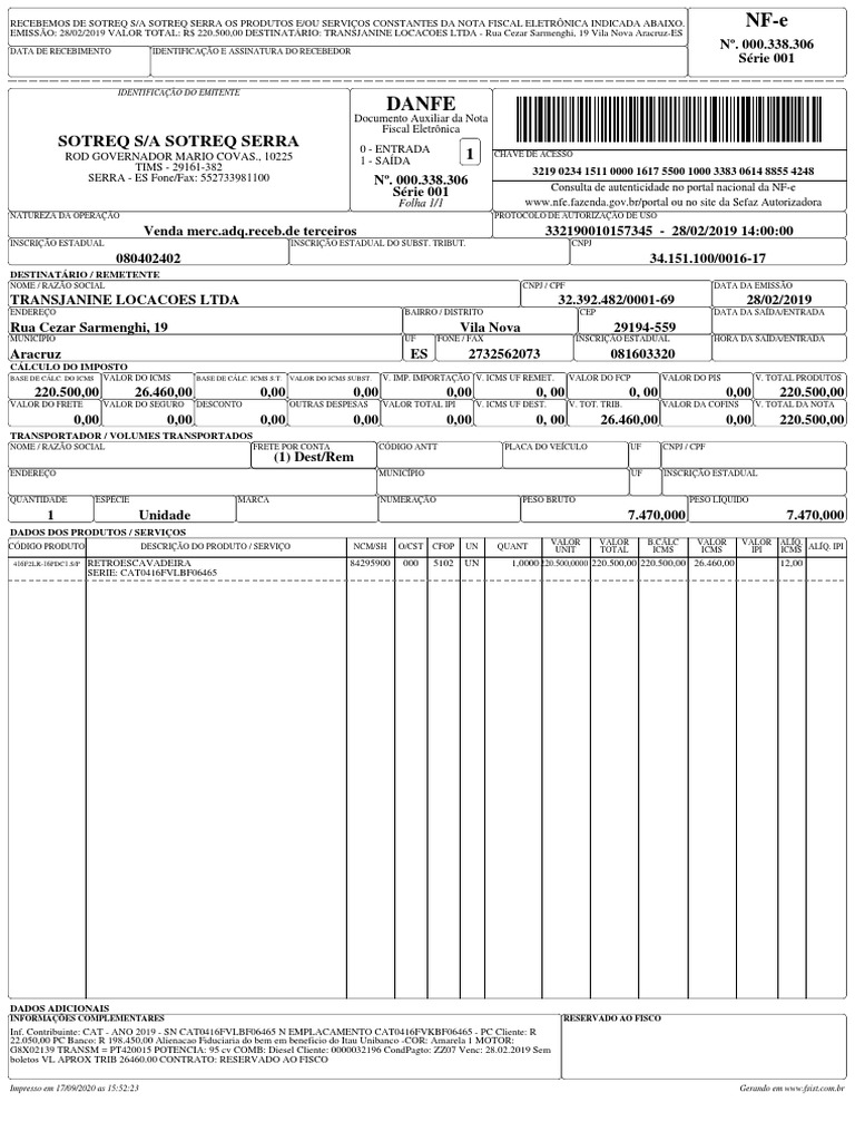 RECEBEMOS DE SOTREQ S/A SOTREQ SERRA OS PRODUTOS E/OU SERVIÇOS CONSTANTES DA NOTA FISCAL ELETRÔNICA INDICADA ABAIXO.