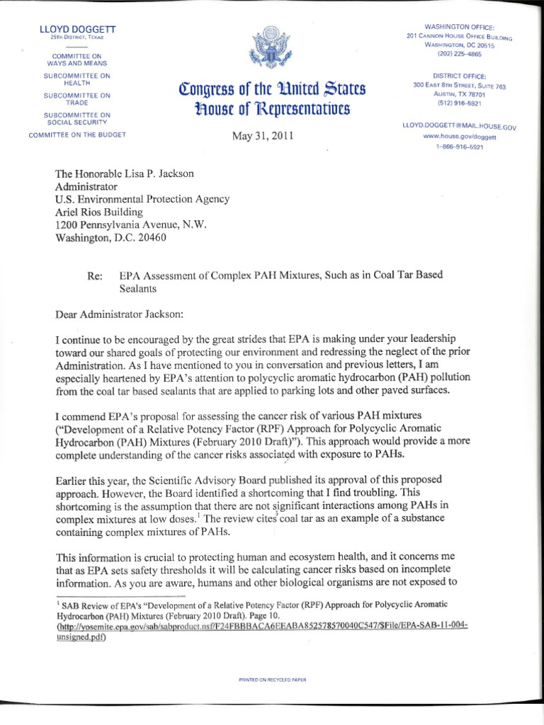 This is a letter dated May 31, 2011 from Congressman Lloyd Doggett to the EPA Administrator complimenting the EPA on environmental improvements, but challenging them to complete their work o…Descrição completa