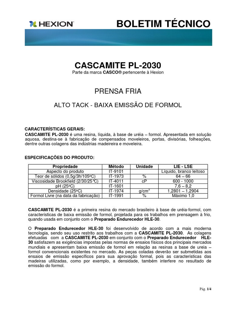 CASCAMITE PL-2030 é a primeira resina do mercado brasileiro à base de uréia-formol, com