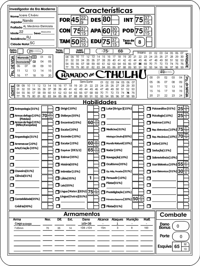 O Esquivar (D ES/2) 65 Nadar(20%) Seduc;ao[15%)