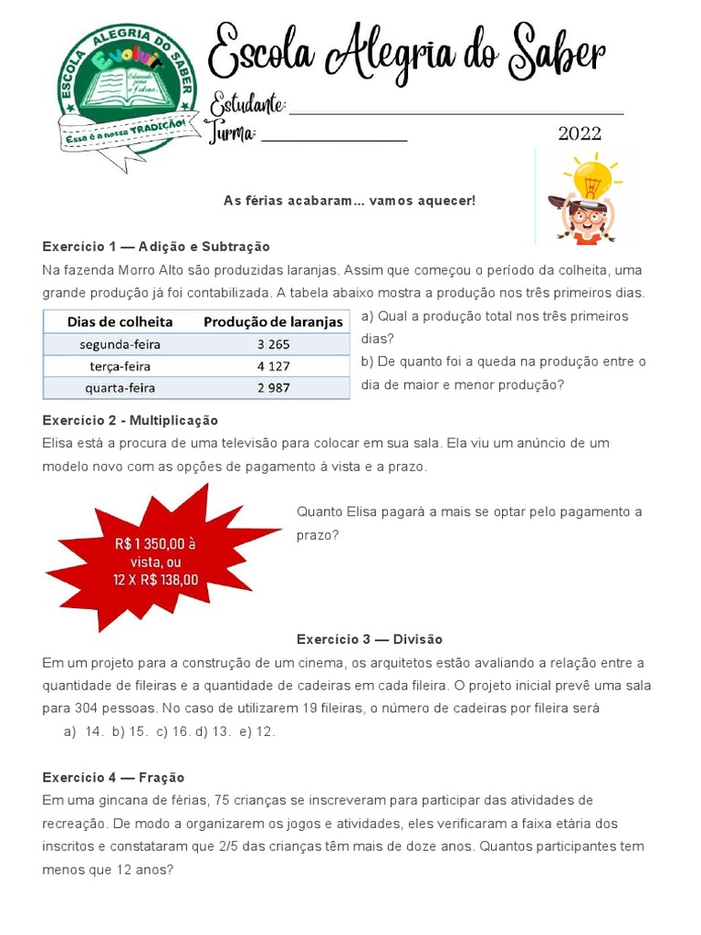 Exercício 8 - PROBLEMAS COM NÚMEROS INTEIROS.