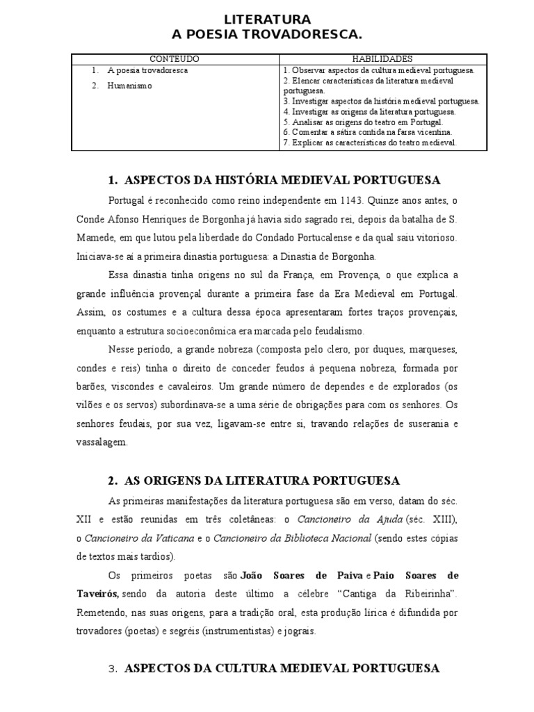 1. A poesia trovadoresca 1. Observar aspectos da cultura medieval portuguesa.
