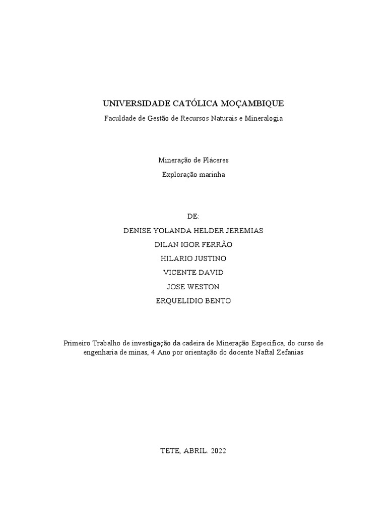 engenharia de minas, 4 Ano por orientação do docente Naftal Zefanias