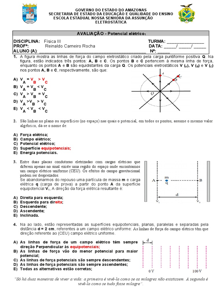 são equidistantes da carga Q. Os potenciais eletrostáticos V (A),