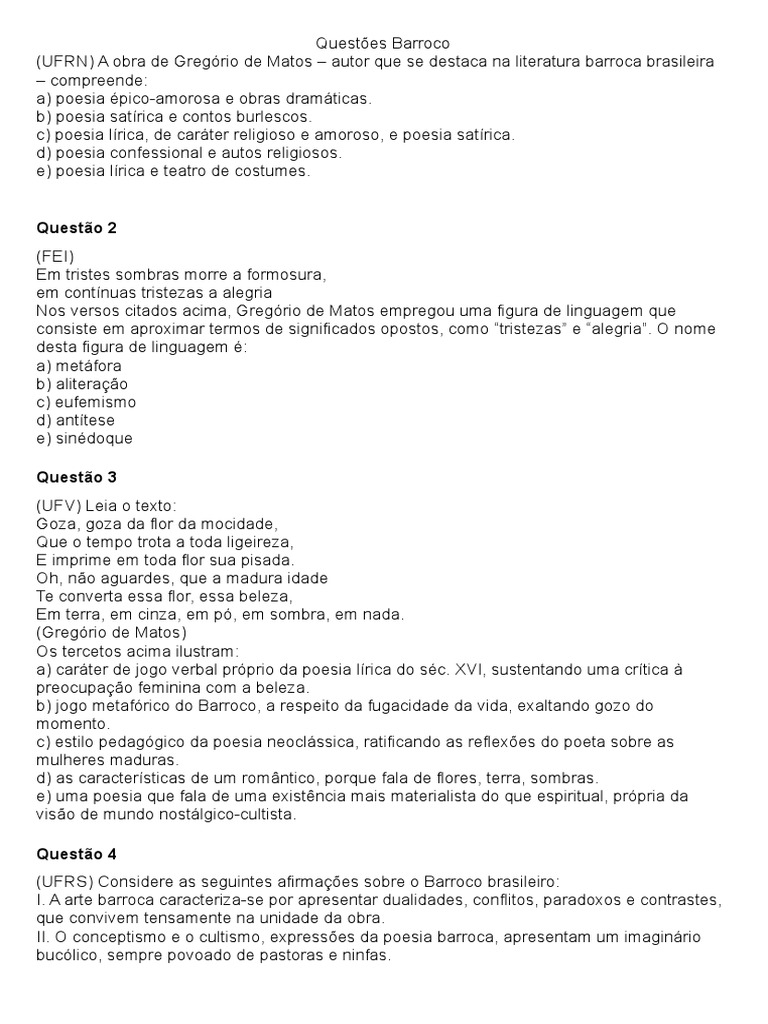 (UFRN) A obra de Gregório de Matos – autor que se destaca na literatura barroca brasileira