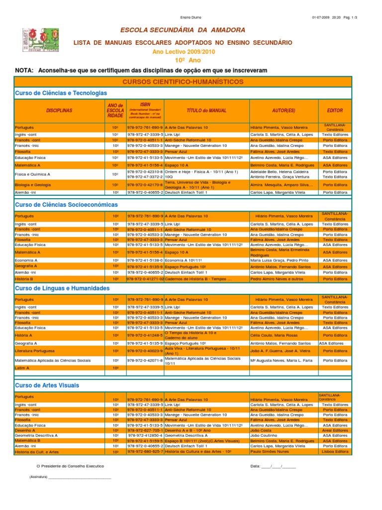 nº na contracapa do manual) TÍTULO do MANUAL Entre Margens . João Carlos Silva… ASA Curso de Ciências Socioeconómicas Português Educação Fisica Matemática A Alemão .12.12º Movimento -Um Estilo de Vida 10º/11º/12º Espaço 12 A Biologia e Geologia 11 Caderno de Actividades. Maria da Luz Oliveira. Daniel Marques da Silva Teresa Sobrinho Simões…. Lúcia Rêgo… Belmiro Costa / Mº Ermelinda Pedro Martins. Osório Santos. Ferreira Almerinda Diniz e outros Célia Pinto do Couto e outros Porto Editora Texto Editores Porto Editora Curso de Artes Visuais Português Educação Física Desenho A Oficina Multimédia B Oficina de Artes Materiais e Tecnologias Aplicações Informáticas B Área de Projecto 12º 12º 12º 12º 12º 12º 12º 12º 978-972-0-40028-5 Entre Margens . Maria Manuela Góis Texto Editores Cristina Domingos/Jorge Lemos … Plátano Elsa Silva/Helena Mendes Plátano Almerinda Diniz e outros Texto Editores Manuela Monteiro/Pedro T. Noémia Rodriguesexto Editores T M. Ferreira Porto Editora Curso de Línguas e Humanidades Português Educação Física Francês inic Inglês -cont Francês -cont Filosofia A Geografia C Latim B Literatura de Lingua Portuguesa Psicologia B Aplicações Informáticas B Direito História A Área Projecto 12º 12º 12º 12º 12º 12º 12º 12º 12º 12º 12º 12º 12º 12º 978-972-0-40028-5 978-972-41-5133-5 978-972-0-40549-4 978-972-47-3868-0 978-972-47-3871-0 Entre Margens .Nouvelle Géneration 12 (Iniciação) Link Up 12º . Lúcia Rêgo… ASA Editores Belmiro Costa / Mº Ermelinda ASA Carlos Lapa. Santos.12º Movimento -Um Estilo de Vida 10º/11º/12º Espaço 12 A Deutsch Einfach Toll! 2 Sociologia 12º Geografia C Economia C . Marta D. Ramalho Texto Editores Graça Ventura … Texto Editores Osório da Cunha M.Conceição Dantas.º Ano Direito 12º Ser Humano Olga Magalhães / Fernanda Costa Porto Editora Avelino Azevedo. Ferreira Porto Editora Elsa Ribeiro. Maria Olinda Reis Texto Editores Cristina Domingos/Jorge Lemos … Plátano 978-972-770-677-8 Geografia C 978-972-0-43296-4 Ser Humano 978-972-47-3889-5 Direito 12º 978-972-0-41250-8 O Tempo da História Manuela Monteiro/Pedro T.Ensino Diurno 01-07-2009 01-07-2009 Pág.Biologia e Geol 11 AUTOR(ES) Olga Magalhães / Fernanda Costa Avelino Azevedo. Fernanda Martins..FR 12º Olga Magalhães / Fernanda Costa Porto Editora Avelino Azevedo. Margarida Vilela Porto Editora Belmiro Gil Cabrito.12º 978-972-41-5133-5 Movimento -Um Estilo de Vida 10º/11º/12º 978-972-627-858-9 Desenho 12º A/B Olga Magalhães / Fernanda Costa Avelino Azevedo. 3 /3 ESCOLA SECUNDÁRIA DA AMADORA LISTA DE MANUAIS ESCOLARES ADOPTADOS NO ENSINO SECUNDÁRIO Ano Lectivo 2009/2010 12º Ano NOTA: Aconselha-se que se certifiquem das disciplinas de opção em que se inscreveram CURSOS CIENTIFICO-HUMANÍSTICOS Curso de Ciências e Tecnologias DISCIPLINAS Português Educação Física Matemática A Biologia e Geologia II Física e Química A II Química Física Biologia Psicologia B Geologia Aplicações Informáticas B Área de Projecto ANO de ESCOLA RIDADE 12º 12º 12º 12º 12º 12º 12º 12º 12º 12º 12º 12º ISBN (International Standart Book Number . EDITOR Porto Editora ASA Editores ASA Areal Lisboa Editora Porto Editora 978-972-0-40028-5 978-972-41-5133-5 978-972-41-4288-4 978-989-647-000-5 978-989-647-001-2 978-972-680-564-3 978-972-0-42216-5 978-972-47-3874-1 978-972-47-3880-2 978-989-647-050-0 978-972-0-43296-4 978-989-23-0424-3 Desafios da Física Química em Contexto Jogo de Partículas 12 12 F Biologia 12º Ser Humano Geodesafios 12º M. Lúcia Rêgo… João Costa Porto Editora ASA Editores Areal Editores O Presidente do Conselho Executico (Assinatura) __________________________________ Data: ____/____/______ .nível 2 Sociologia Geografia C Economia C Direito Psicologia B Aplicações Informáticas B Área de Projecto 12º 12º 12º 12º 12º 12º 12º 12º 12º 12º 12º 978-972-0-40028-5 978-972-41-5133-5 978-972-41-4288-4 978-972-04-656-9 978-972-47-3883-3 978-972-770-677-8 978-972-770-674-7 978-972-47-3889-5 978-972-0-43296-4 Entre Margens . Pedro Nuno… Areal Manuela Monteiro/Pedro T. Idalina Crespo Porto Editora Carlota Santos Martins.12º Movimento -Um Estilo de Vida 10º/11º/12º Manège . Lúcia Rêgo… ASA Editores Ana Gueidão.