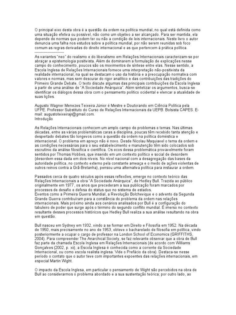 a ou possvel, no como um objetivo a ser alcanado. Para ser mantida, ela depende de normas que podem ter ou no a condio de leis internacionais. Neste livro o autor denuncia uma falha nos estudos sobre a poltica mundial, por no serem reunidas sob foco comum as regras derivadas do direito internacional e as que pertencem prtica poltica. ----------------------As variantes neo do realismo e do liberalismo em Relaes Internacionais caracterizam-se por abraar a epistemologia positivista. Alm de dominarem a formulao de explicaes nesse campo do conhecimento, poucos so os movimentos de sntese entre elas. Nesse sentido, a Escola Inglesa de Relaes Internacionais fornece uma interpretao no-positivista da realidade internacional, na qual se destacam o uso da histria e a preocupao normativa com valores e normas, mas sem descurar do rigor analtico e das contribuies das tradies do Primeiro Grande Debate. O texto discute algumas das principais contribuies da Escola Inglesa a partir de uma anlise de A Sociedade Anrquica. Alm sintetizar os argumentos, busca-se identificar os dilogos dessa obra com o pensamento poltico ocidental e elencar a atualidade de suas lies. Augusto Wagner Menezes Teixeira Jnior Mestre e Doutorando em Cincia Poltica pela UFPE. Professor Substituto do Curso de Relaes Internacionais da UEPB. Bolsista CAPES. Email: augustoteixeirajr@[Link]. Introduo As Relaes Internacionais conhecem um amplo campo de problemas e temas. Nas ltimas dcadas, entre as vrias problemticas caras a disciplina, poucas tm recebido tanta ateno e despertado debates to longevos como a questo da ordem na poltica domstica e internacional. O problema em apreo no novo. Desde Nicolau Maquiavel o tema da ordem e as condies necessrias para o seu estabelecimento e manuteno tm sido colocados sob escrutnio da anlise filosfica e cientfica. Os ecos dessa problemtica provavelmente foram sentidos por Thomas Hobbes, que inserido em um contexto poltico e social de desordem (desordem essa dada em dois nveis. No nvel nacional com a desagregao das bases da autoridade poltica, no contexto externo pela constante ameaa e o medo de aes violentas de outros reinos contra a Gr-Bretanha), pensou uma alternativa poltica para instaurar a ordem. Passados cerca de quatro sculos aps essas reflexes, emerge no contexto terico das Relaes Internacionais a obra A Sociedade Anrquica, de Hedley Bull. Trazida ao pblico originalmente em 1977, os anos que precederam a sua publicao foram marcados por processos de desafio e defesa do status quo no sistema de estados. Eventos como a Primeira Guerra Mundial, a Revoluo Bolchevique e o advento da Segunda Grande Guerra contriburam para a constncia do problema da ordem nas relaes internacionais. Mais prximo ainda aos cenrios analisados por Bull a configurao do tabuleiro de poder que surge aps o trmino do segundo conflito mundial. imerso no contexto resultante desses processos histricos que Hedley Bull realiza a sua anlise resultando na obra em questo. Bull nasceu em Sydney em 1932, vindo a se formar em Direito e Filosofia em 1952. Na dcada de 1950, mais precisamente no ano de 1953, obteve o bacharelado de filosofia em poltica, vindo posteriormente a ocupar o cargo de professor na London School of Economics (GRIFFITHS, 2004). Para compreender The Anarchical Society, se faz relevante observar que a obra de Bull faz parte da chamada Escola Inglesa em Relaes Internacionais (de acordo com Williams Gonalves (2002, p. xii), a Escola Inglesa conhecida como a corrente da Sociedade Internacional, ou como escola realista inglesa. Vide o Prefcio da obra). Destaca-se nesse perodo o contato que o autor teve com importantes expoentes das relaes internacionais, em especial Martin Wight. O impacto da Escola Inglesa, em particular o pensamento de Wight so percebidos na obra de Bull ao considerarmos o problema abordado e a sua sustentao terica; por outro lado, ao