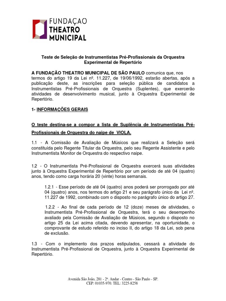 junto à Orquestra Experimental de Repertório por um período de até 04 (quatro)