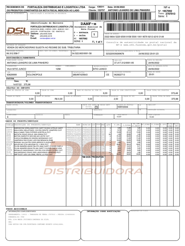 RECEBEMOS DE FORTALEZA DISTRIBUICAO E LOGISTICA LTDA Carga: 139311 Data: 24/06/2022 NF-e