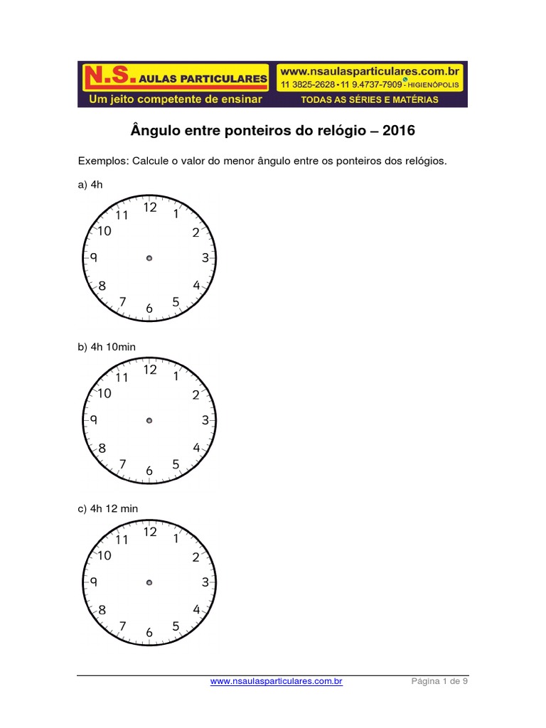 Exemplos: Calcule o valor do menor ângulo entre os ponteiros dos relógios.