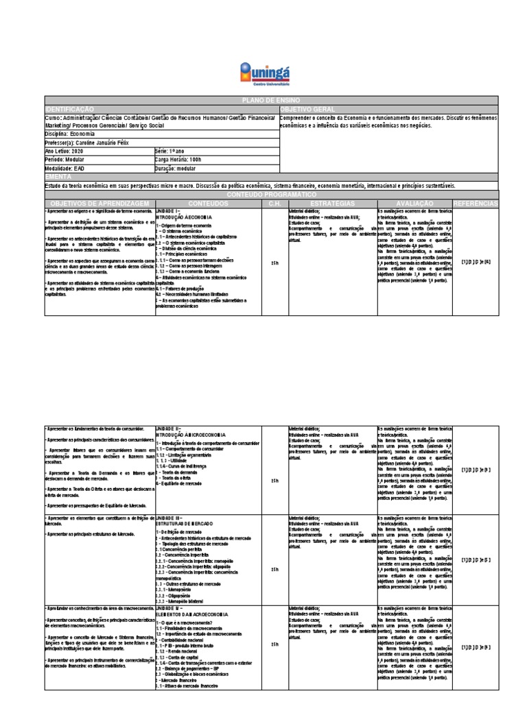 Curso: Administração/ Ciências Contábeis/ Gestão de Recursos Humanos/ Gestão Financeira/ Compreender o conceito da Economia e o funcionamento dos mercados. Discutir os fenômenos