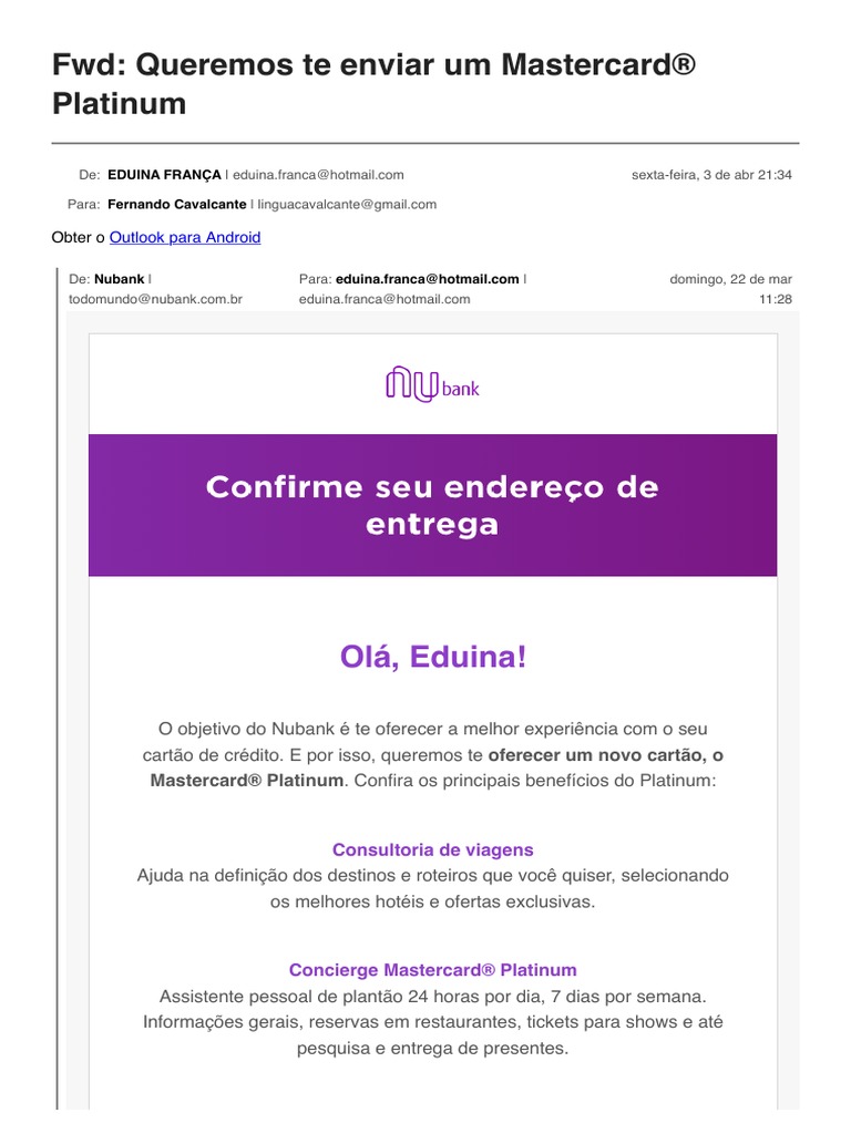 De: Nubank | Para: eduina.franca@hotmail.com | domingo, 22 de mar
