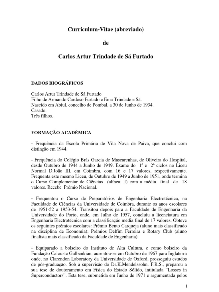 Curriculum-Vitae (abreviado) de Carlos Artur Trindade de S Furtado