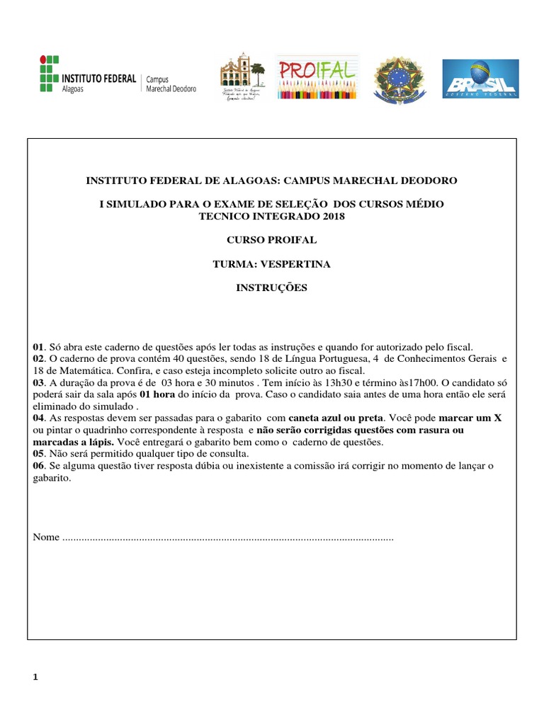 I SIMULADO PARA O EXAME DE SELEÇÃO DOS CURSOS MÉDIO