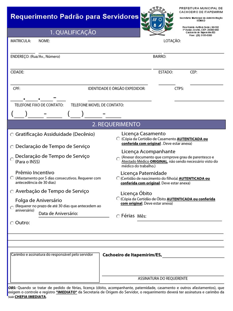 Requerimento Padrão para Servidores Secretaria Municipal de Administração