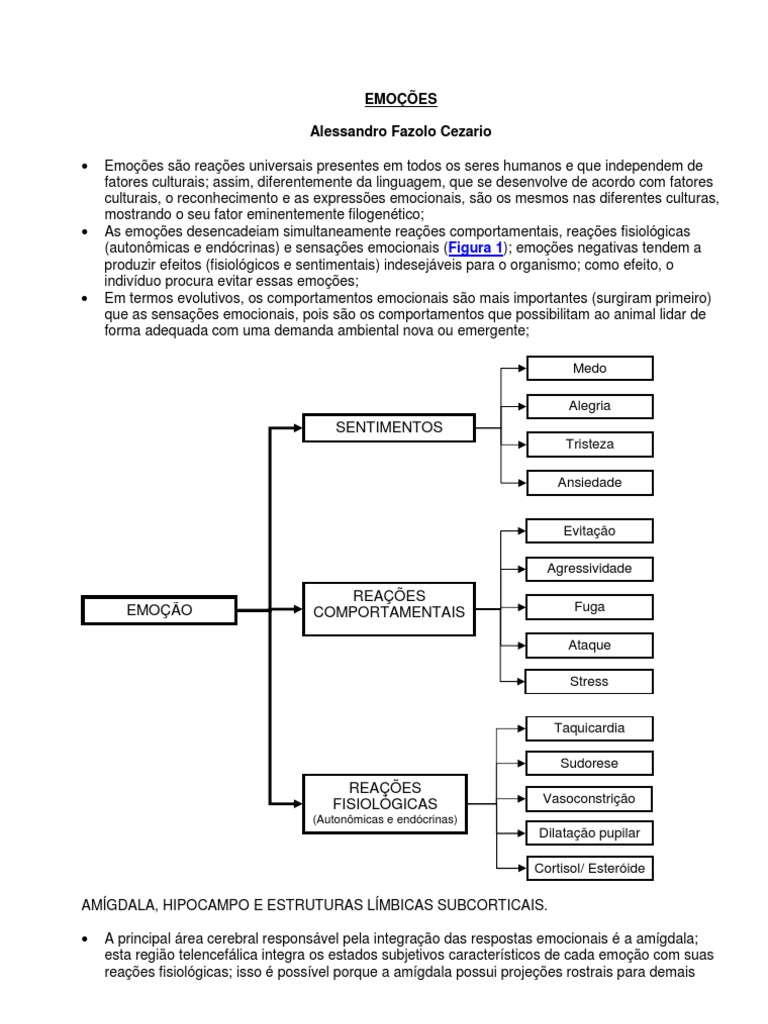 culturais; assim, diferentemente da linguagem, que se desenvolve de acordo com fatores culturais, o reconhecimento e as expressões emocionais, são os mesmos nas diferentes culturas, mostrando o seu fator eminentemente filogenético; As emoções desencadeiam simultaneamente reações comportamentais, reações fisiológicas (autonômicas e endócrinas) e sensações emocionais (Figura 1); emoções negativas tendem a produzir efeitos (fisiológicos e sentimentais) indesejáveis para o organismo; como efeito, o indivíduo procura evitar essas emoções; Em termos evolutivos, os comportamentos emocionais são mais importantes (surgiram primeiro) que as sensações emocionais, pois são os comportamentos que possibilitam ao animal lidar de forma adequada com uma demanda ambiental nova ou emergente;