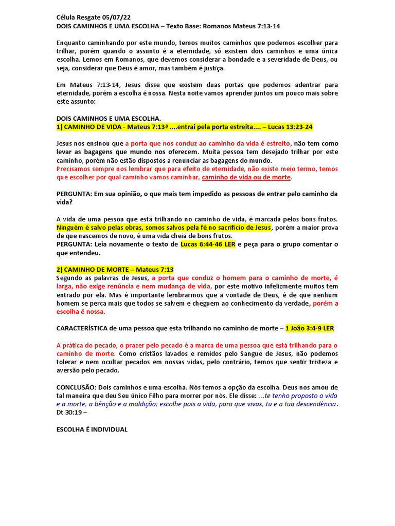 que escolher por qual caminho vamos caminhar, caminho de vida ou de morte.