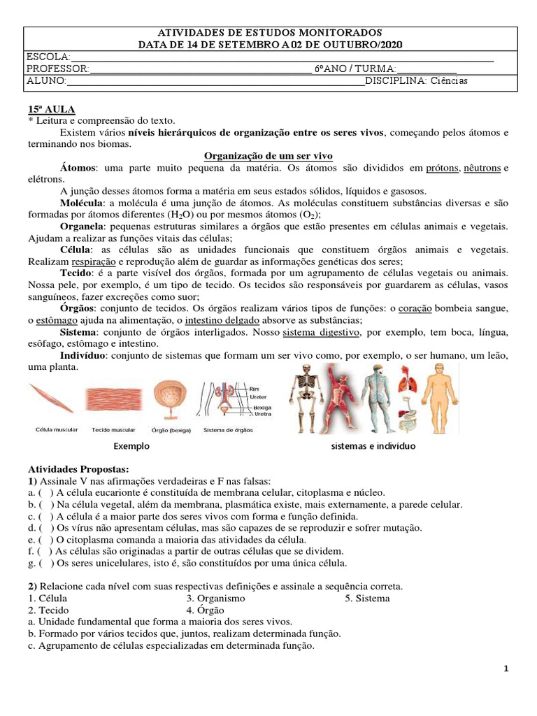 1) Existem vários níveis hierárquicos de organização entre os seres vivos, começando pelos átomos e