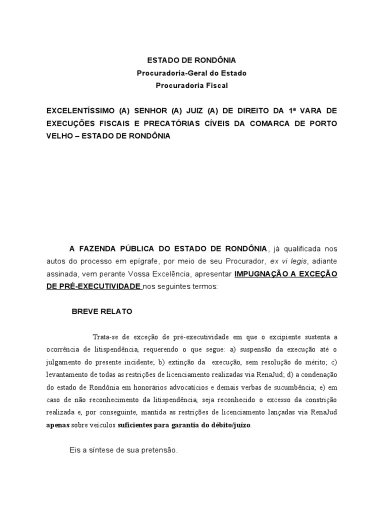 Pelo exposto, requer a Fazenda Pública do Estado de Rondônia a