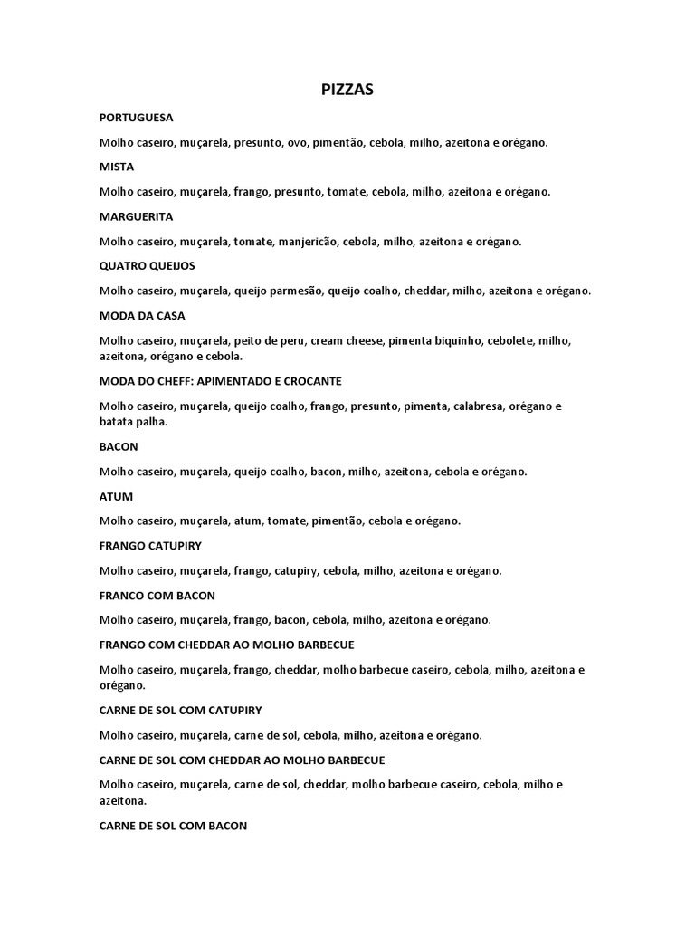Molho caseiro, muçarela, queijo parmesão, queijo coalho, cheddar, milho, azeitona e orégano.