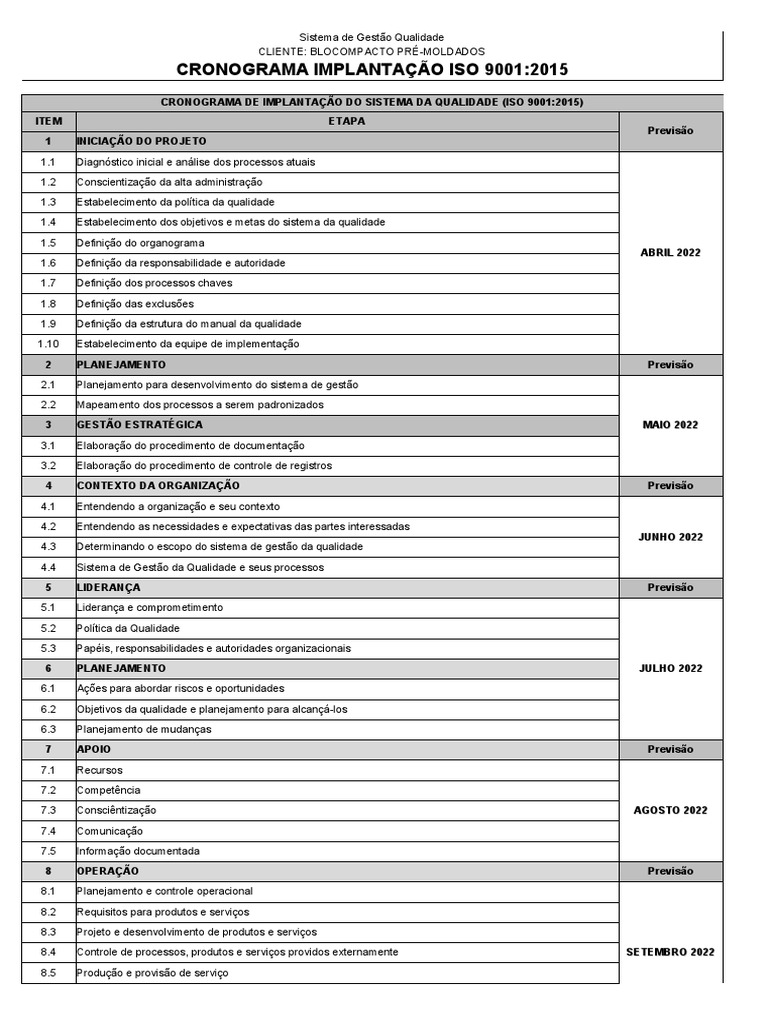 CRONOGRAMA DE IMPLANTAÇÃO DO SISTEMA DA QUALIDADE (ISO 9001:2015)