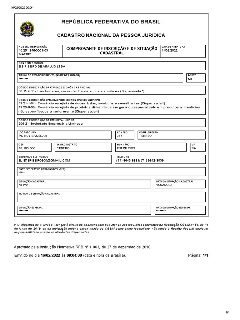 45.251.346/0001-09 COMPROVANTE DE INSCRIÇÃO E DE SITUAÇÃO 11/02/2022